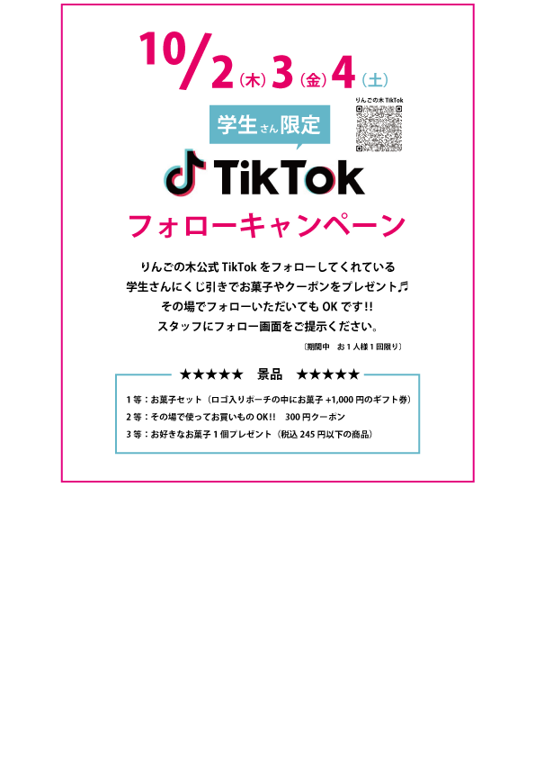 10月2日(木)3日(金)4日(土)の3日間 学生さん限定でTikTokフォローキャンペーンを開催いたします。 学生さん、この機会にぜひりんごの木に遊びにきてください(^^)/