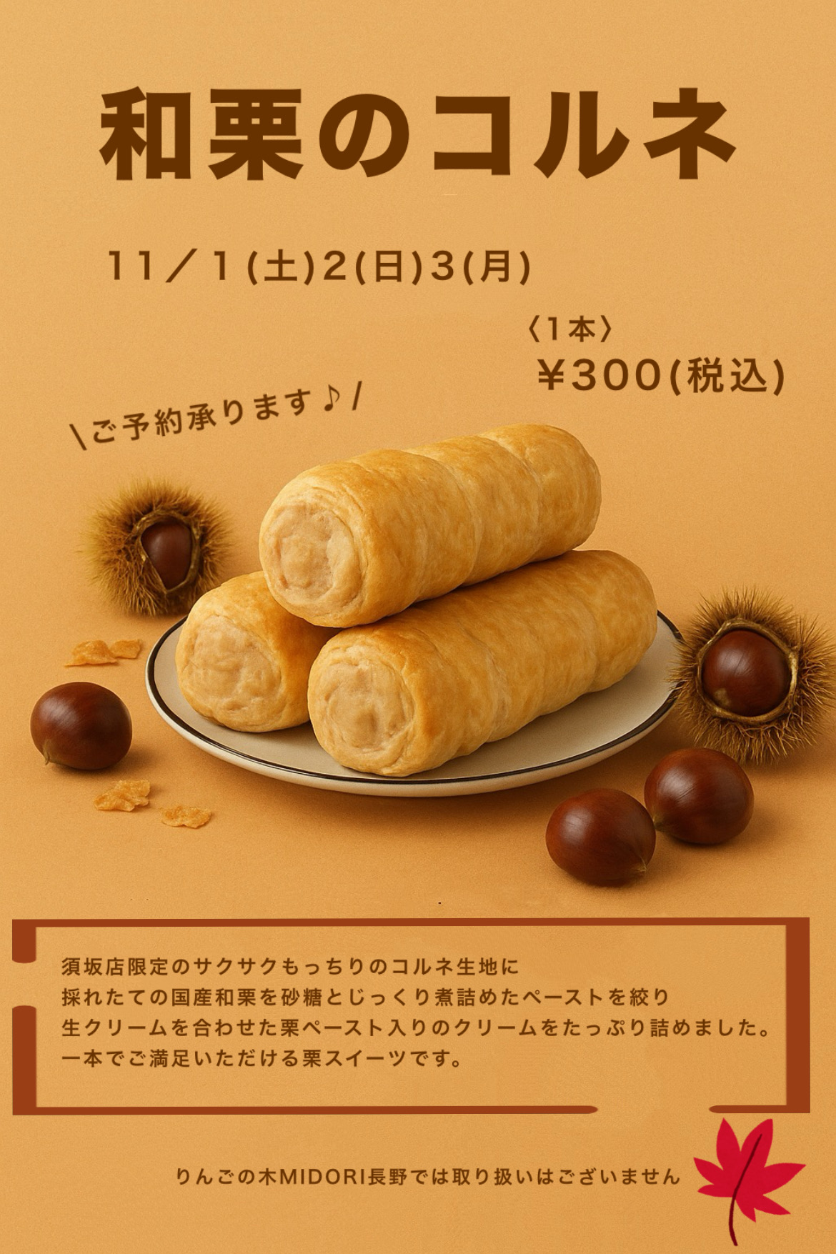 すっかり秋らしくなってきた今日この頃です。 秋といったら栗ですね! りんごの木お初の「和栗のコルネ」販売が決まりました(^^)/ 濃厚な和栗クリームのコルネで秋をご満喫してください‼