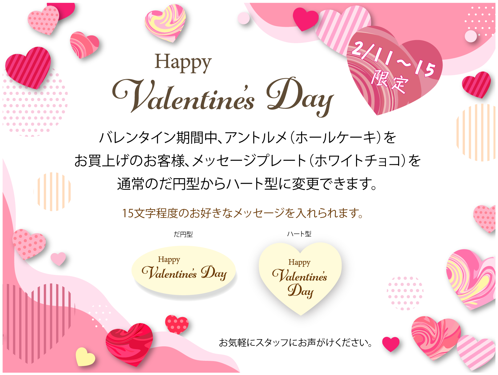 バレンタイン期間中、ホールケーキをお買上げのお客様に嬉しいサービスをご用意(^^)/