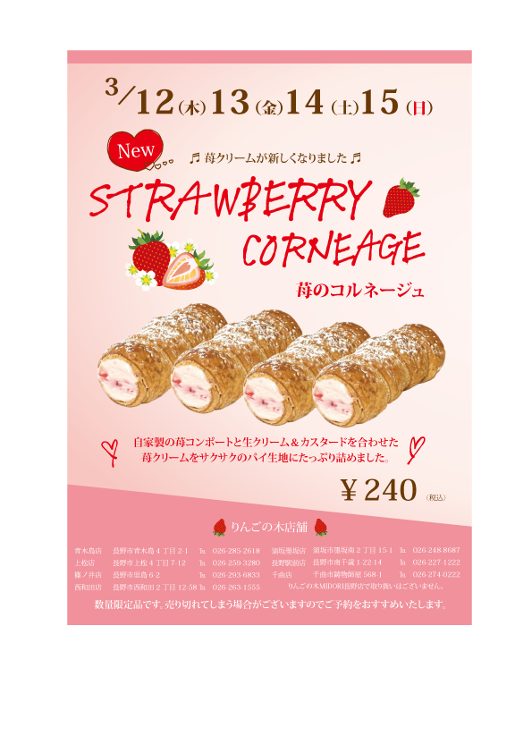 この機会に「苺のコルネージュ」をぜひお召し上がりください(^-^)/