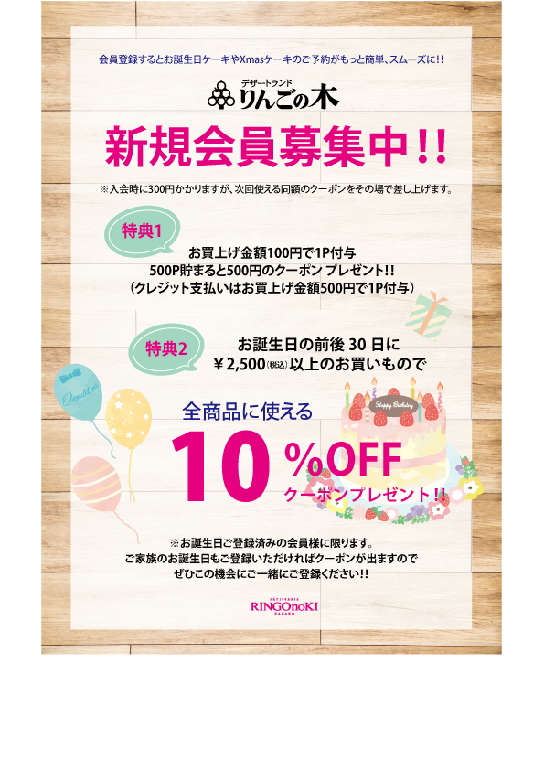 りんごの木では新規会員様を募集しております。 ポイントが貯まると500円クーポンのプレゼントやお誕生日には嬉しい10%OFFクーポンをプレゼント(^^)/ 詳しい内容は下記をご覧ください。 各店舗にて入会のお手続きをお受けしておりますのでこの機会にぜひご入会ください♪♪ りんごの木店舗